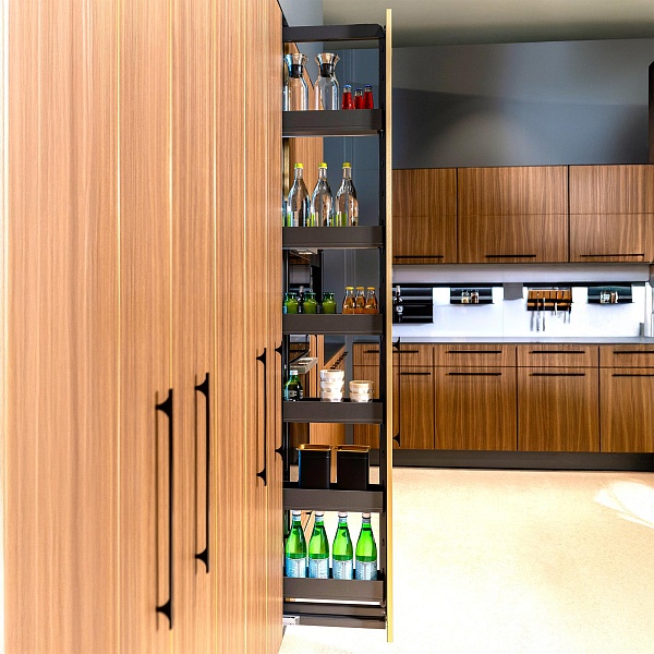 • Механизм Диспенса 90° позволяет организовать централизованное хранение продуктов в узкой секции.